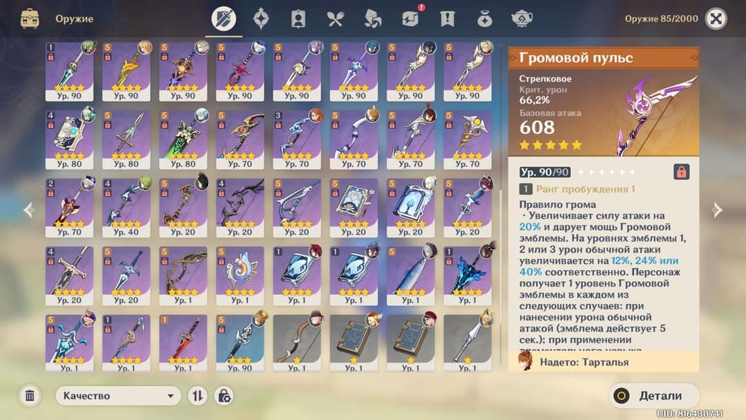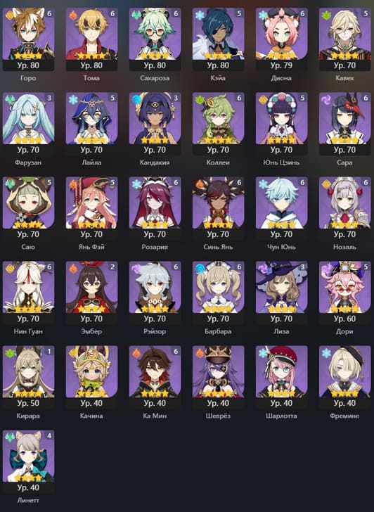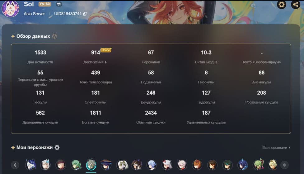 📈 Ранг: 60 🧍‍♀️ Персонажи: Дилюк, Ху Тао, Мона, Аяка, Е Лань, Чжун Ли, Тарталья, Ёимия, Тигнари, Ци Ци и другие ✨ Примогемы: 6150