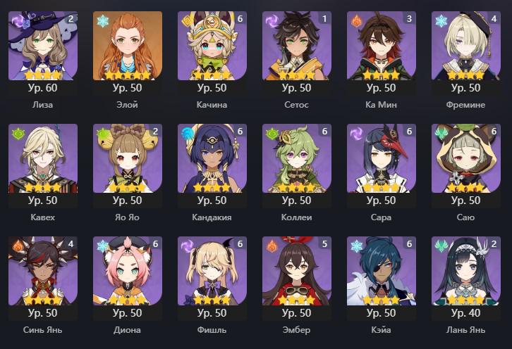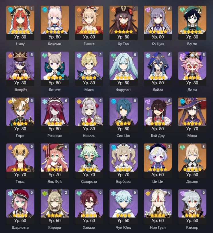 📈 Ранг: 60 🧍‍♀️ Персонажи: Дилюк, Ху Тао, Мона, Аяка, Е Лань, Чжун Ли, Тарталья, Ёимия, Тигнари, Ци Ци и другие ✨ Примогемы: 6150