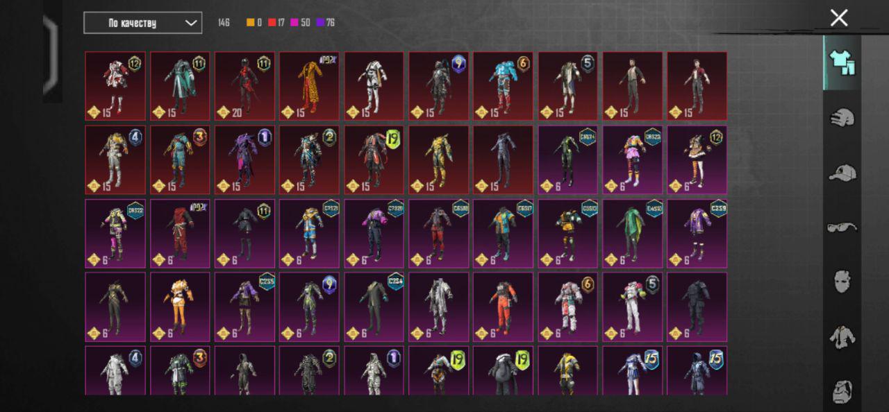 👚Топ костюмы: 50; ⭐️Royale Pass: с 3 сезонна; 🌈Скины на оружие: 6;